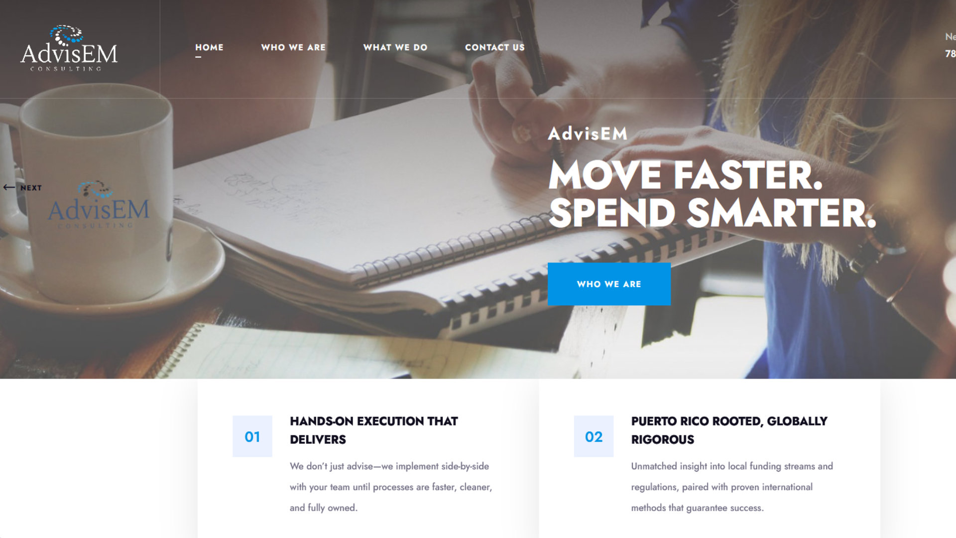 Diseñamos en Edwebstudio una página para la firma de consultoría AdvisEM. Un diseño profesional intuitivo y limpio para destacar sus servicios. Es una página informativa con analytics y SEO optimization.
